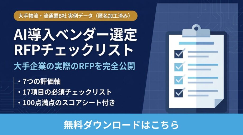予算1,200万円・業務コスト35%削減を目標とした、ある大手物流・流通業B社のAI導入プロジェクトでは、ベンダー選定に際して以下の7軸が評価基準として設定されました。