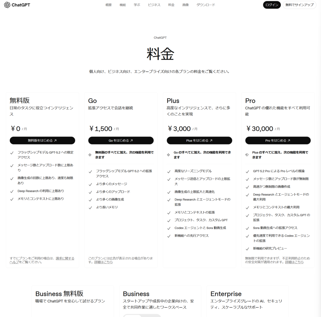 中小企業や特定の部署・プロジェクトチーム向け。セルフサーブ型(Webから即契約可能)で、スモールスタートに適しています。一部資料では「ChatGPT Business」と表記されることもありますが、実質的な位置づけは同等です。 - ChatGPT Enterprise