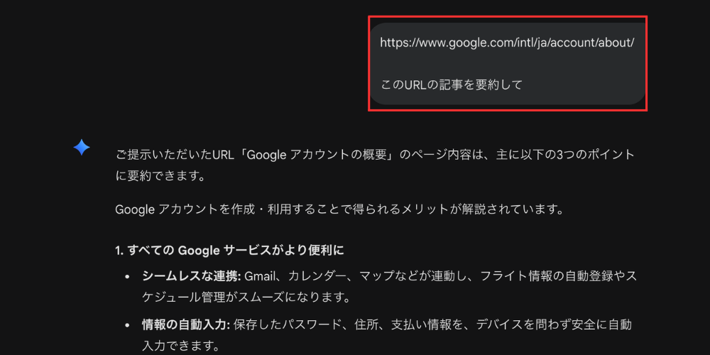 Geminiは、議事録や長い記事を箇条書きで要約するのにも役立ちます。