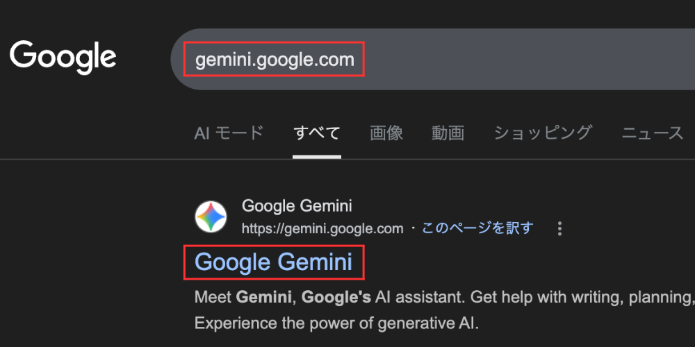 - ブラウザ(Chrome推奨)を開き、アドレスバーに「gemini.google.com」と入力してアクセスします。