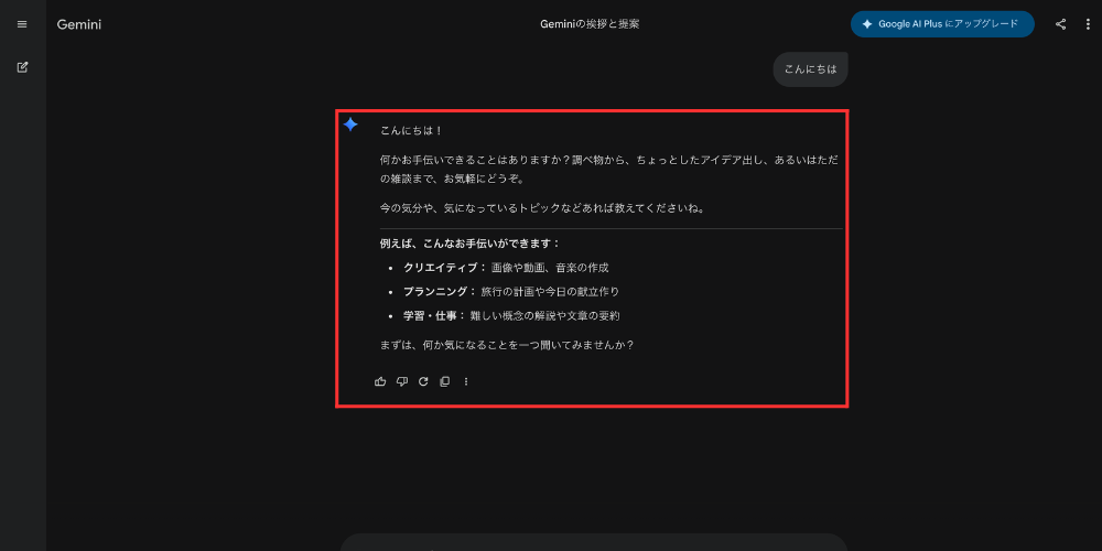 画面中央に、Geminiからの回答が表示されます。回答の下には「評価ボタン」や、回答をコピーするアイコン、回答を再生成するボタンなどが配置されています。