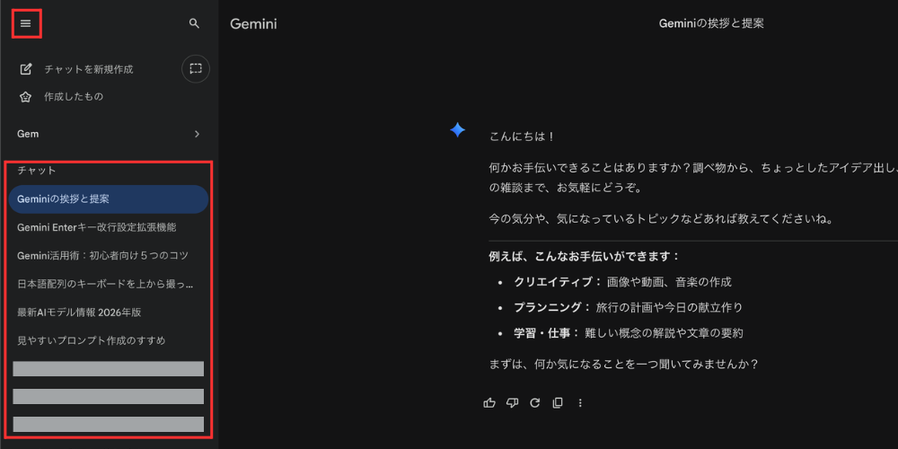 画面左側の三本線をクリックすると、過去のチャット履歴が保存されます。「チャットを新規作成」をクリックすると、履歴をリセットして新規のチャット画面が開きます。