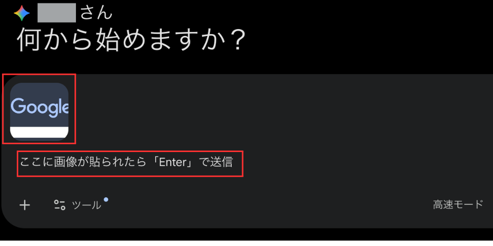 画面下部にあるテキストボックスです。ここに質問や指示(プロンプト)を入力し、紙飛行機アイコン(送信)をクリックするかEnterキーを押すことで、Geminiへの指示が送信されます。
