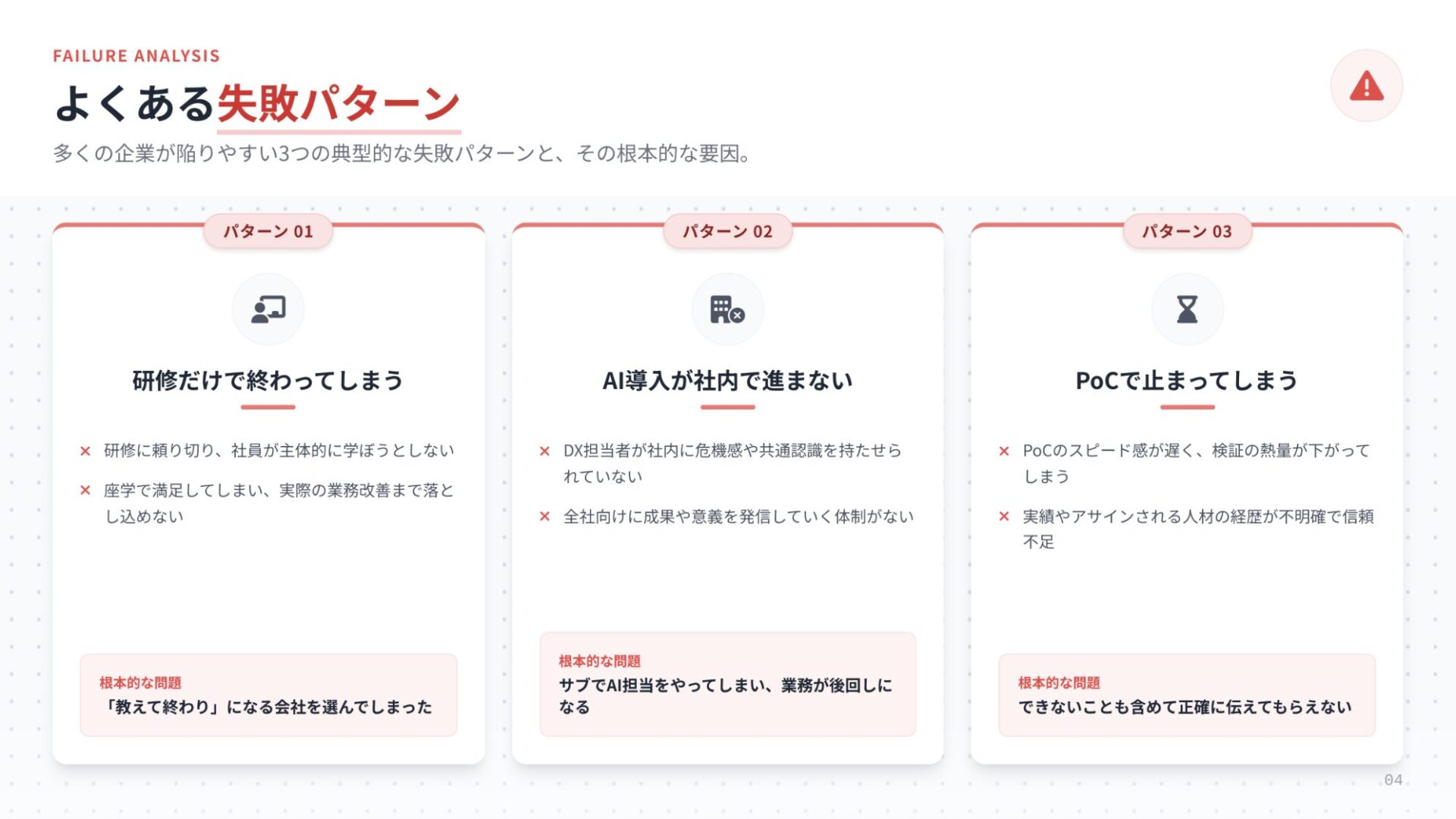 「ツールを入れたが定着しなかった」という失敗を防ぎ、実務に即したAI活用を実現したい企業に最適です。