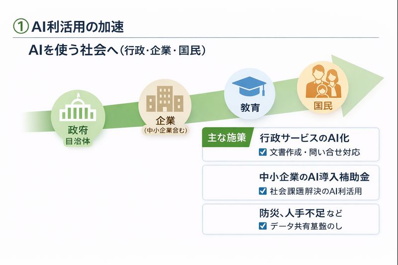 - 【柱1】AI利活用の加速(AIを使う): 社会実装と生産性向上