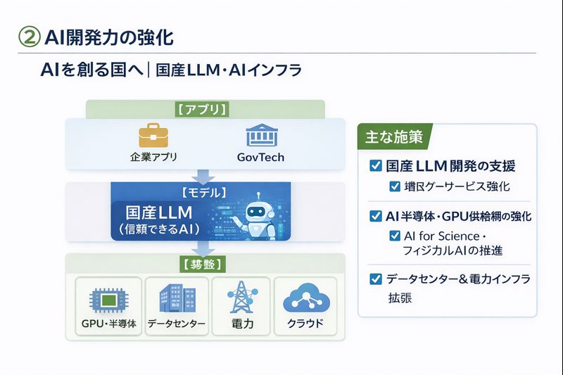 - 【柱2】AI開発力の強化(AIを創る): 国産技術とインフラの確保