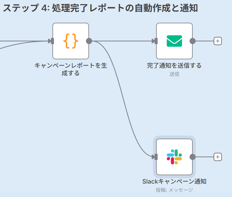 - Generate Campaign Report / Slack Campaign Notification(n8n Codeノード / Slackノード): 処理結果を統合し、HTML形式の完了レポートを生成。そのサマリーをSlackに通知し、担当チームへの情報共有を自動化します。